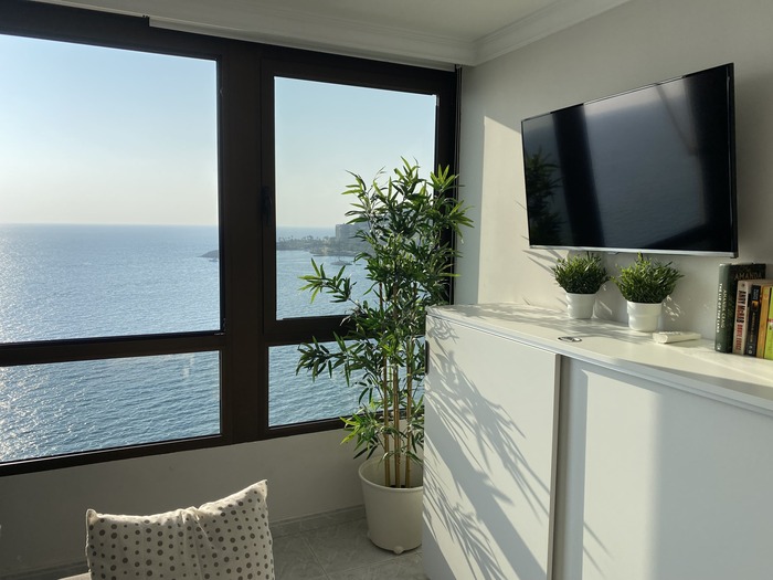 El apartamento es muy amplio, con una ventana enorme con una vista al mar espectacular. Nada mas de abrir la puerta del apartamento, ya se ve el mar. Abriendo la cortina del dormitorio al despertarse, vista mar !!!!
