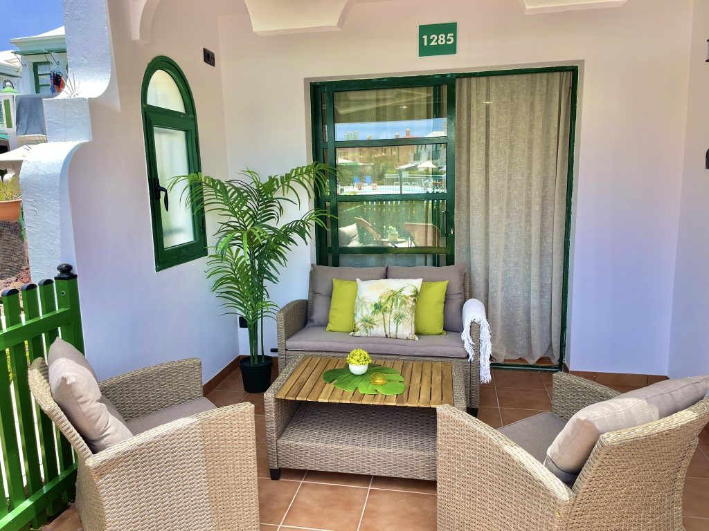 Bungalow Dunaflor Verde 85 by SunHousesCanarias. Cuenta con piscina al aire libre, jardín y terraza. el alojamiento esta ubicado en  Maspalomas, cuenta con wifi gratis y vistas a la piscina. Este apartamento tiene aire acondicionado y ventilación amplia por sus diversas ventanas y balcón. El apartamento tiene 1 dormitorio, cocina con nevera y microondas, TV